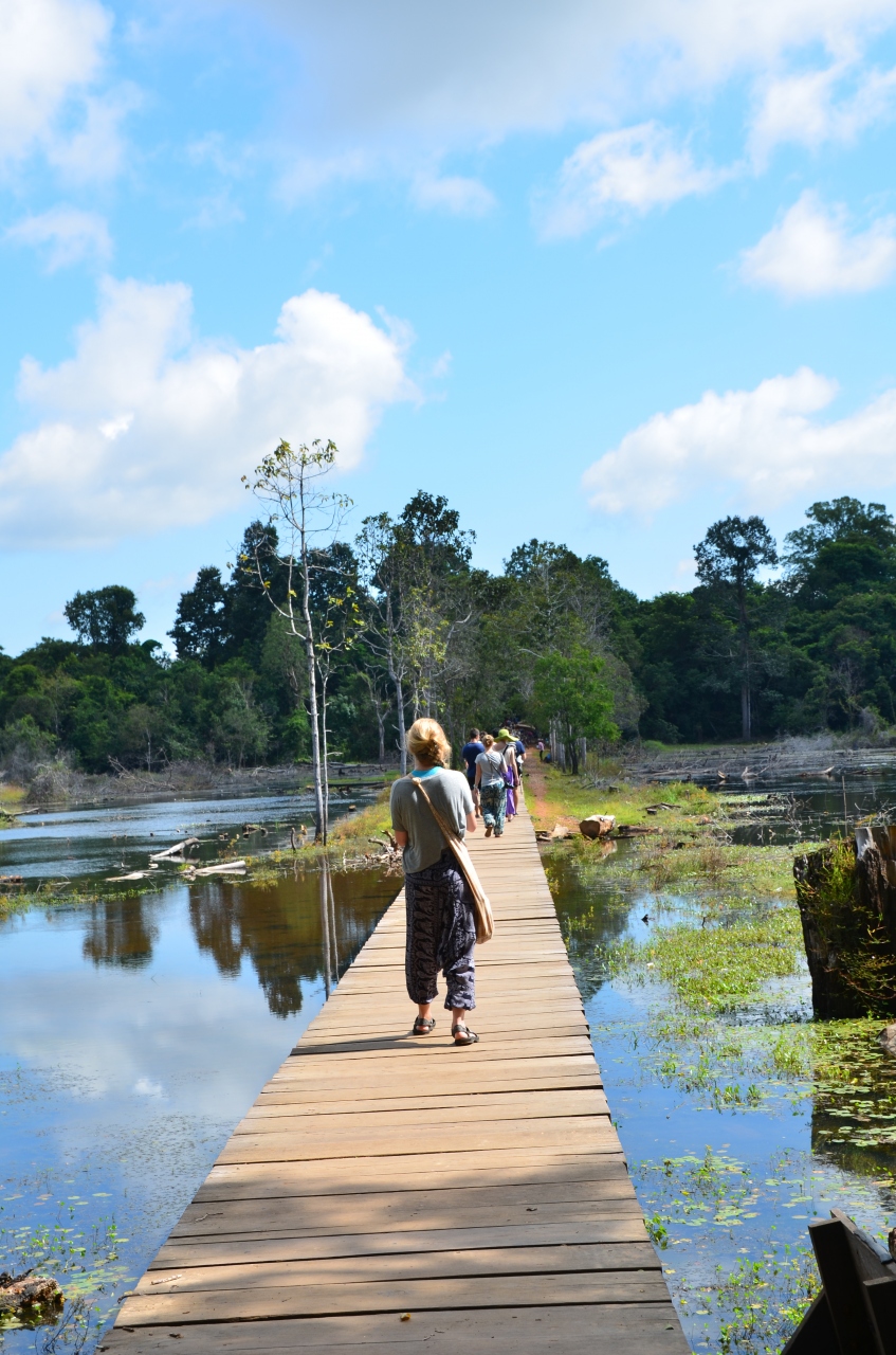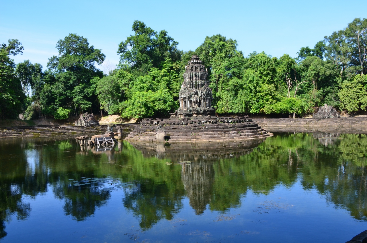 絡み合う蛇という意味のニャックポアン この遺跡は池に浮かぶ祠堂の丸い基壇に蛇が絡みついた姿から命名されているようです。ここは遺跡そのものよりも、遺跡の池に通じる木製の参道の両脇の水辺の光景のほうが幻想的で見ごたえがあります。