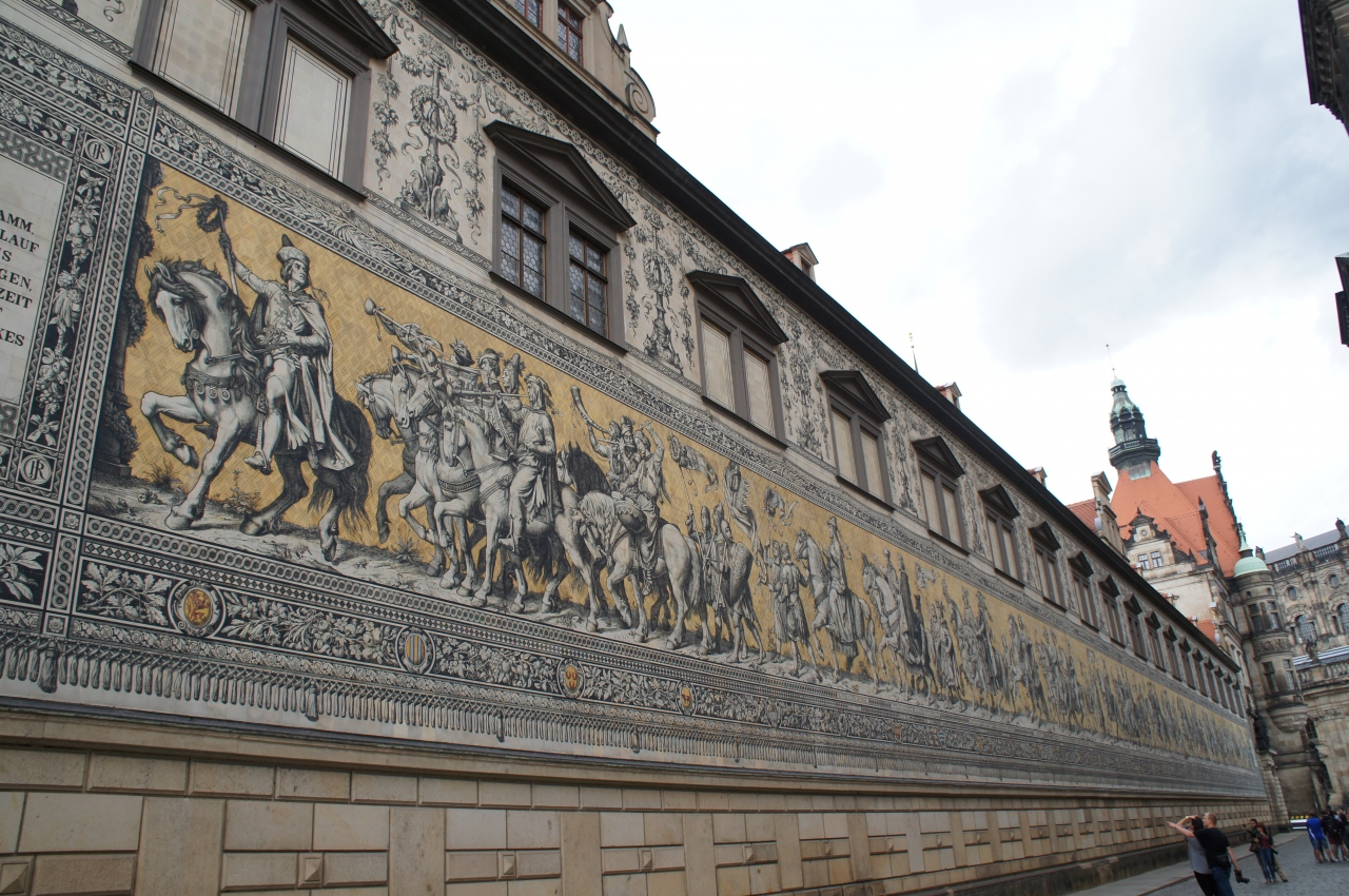 ツアーで行っても必ず見に訪れる有名なマイセン磁器製の壁画です。ドレスデンの歴史的人物の行列が描かれた壮大な壁画の一つのピースが20センチ四方のタイルであることも驚きですが、この壁画が戦火を免れたということはまさに奇跡です。東西の通りに沿ったシュタールホ―フの北側の外壁なので、日の高い時間帯が明るく綺麗に見えると思います。ただし早朝を除いていつも人でいっぱいです。