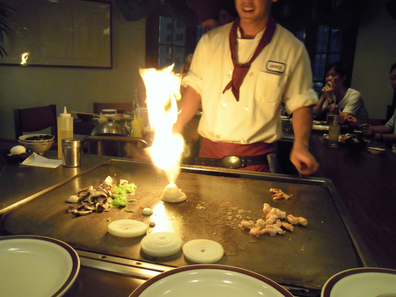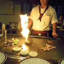 シェフの方が片言の日本語で、パフォーマンスを見せながら野菜炒めやステーキを焼いてくれました。冗談を交えたパフォーマンスがあったりで面白かったですが、毎回リアクションを求められるのですごくめんどくさかったです。鉄板をコテ?でガンガンたたいてリズムをとるパフォーマンスもあるのですが、すごくうるさくて全然話が聞こえない。