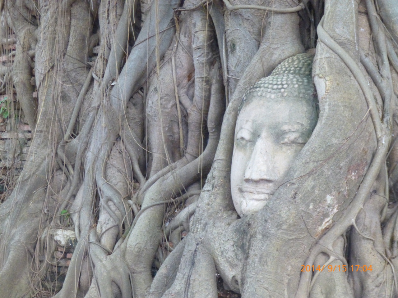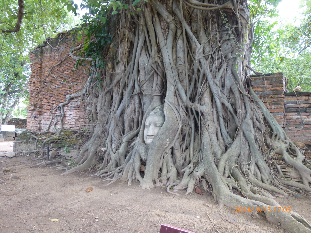 アユタヤで必ずといっていいほど取り上げられるのは木の中に埋まった仏頭でしょうか。まるで木に埋もれて高さ1mから2mくらいの高さにあると想像されている方が多いと思います。(私はディズニー映画のポカホンタスに出てくる言葉を話すおばあさんのイメージでした。)