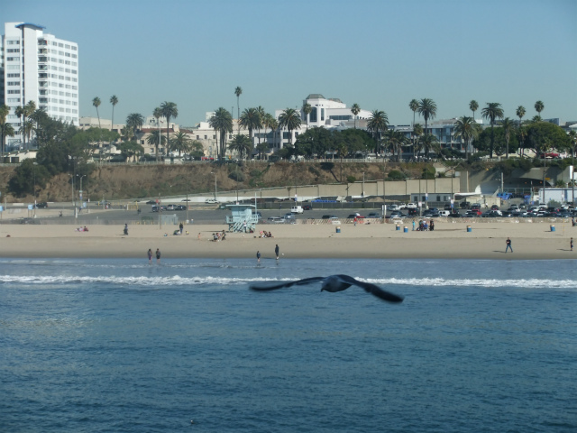 都心からは20番・720番のバスで行けます。木造の桟橋・ピア入口のゲート・ルート66の看板と映画で見たような景色があります。砂浜では寛ぐ人やペットと戯れて遊ぶ人、桟橋では釣りをする人と皆が自由に時間を過ごしている感じがします。鳥も水辺で遊んでいます