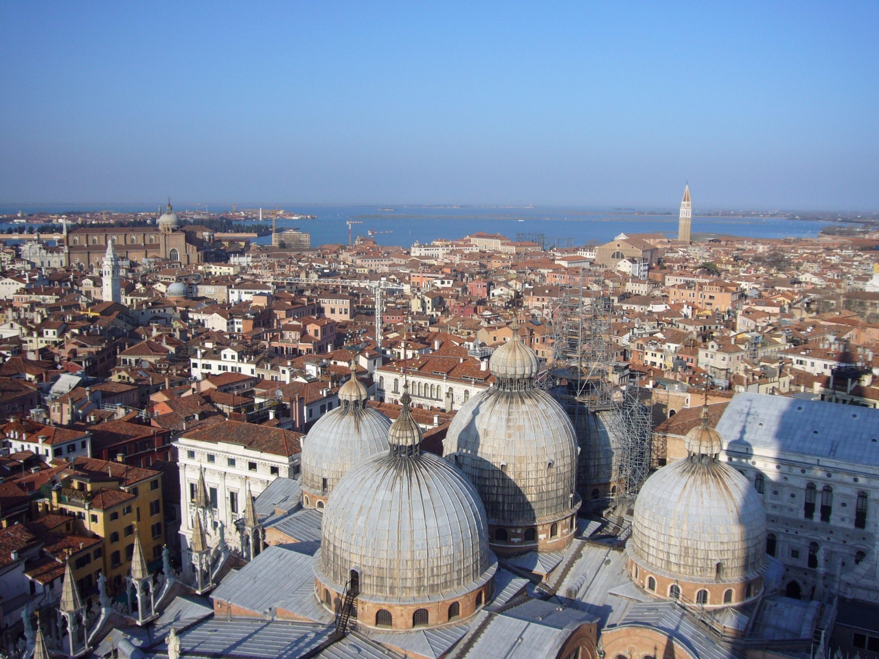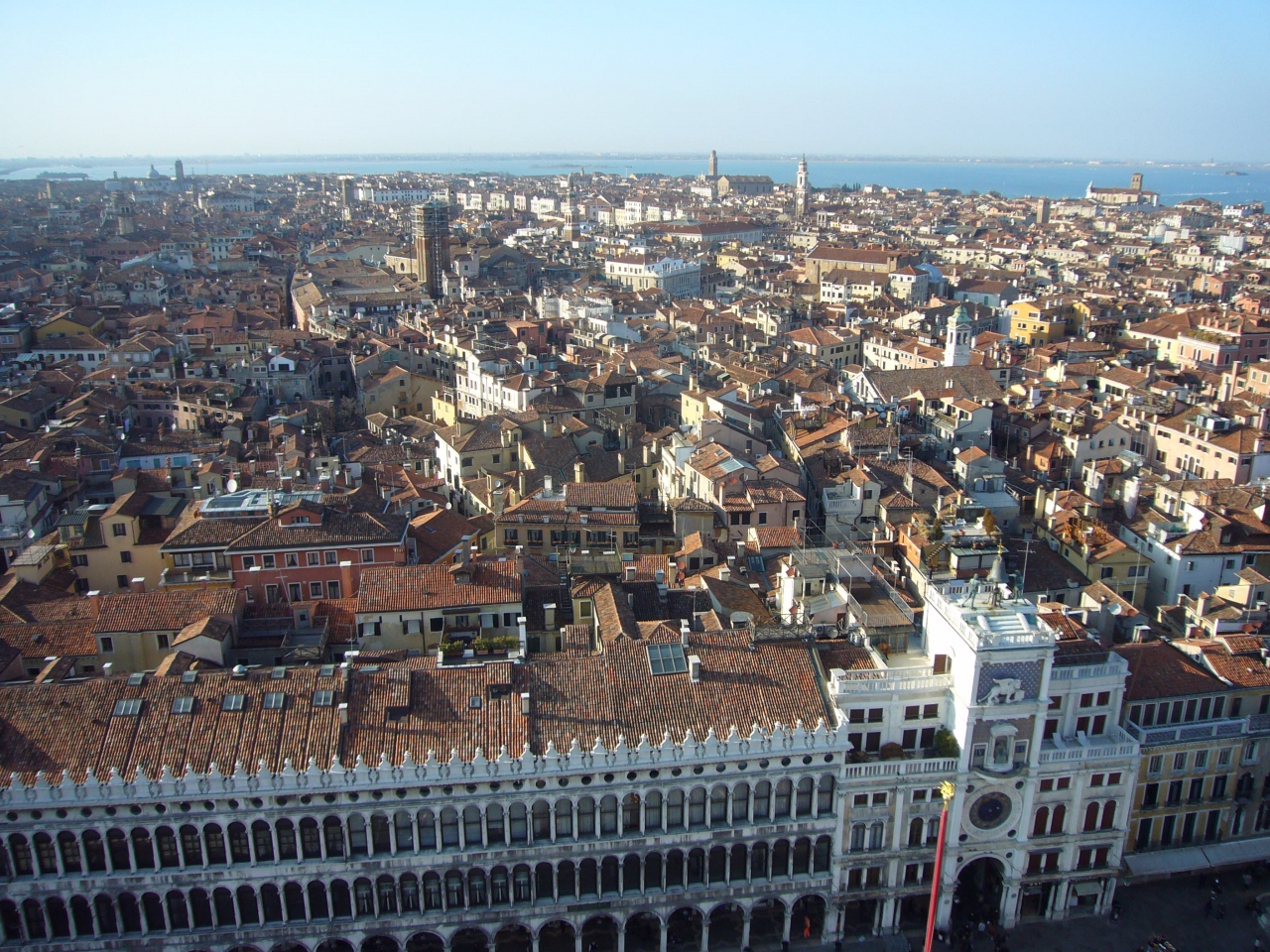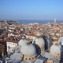 上からはベネチアの街並や海を見下ろす絶景を楽しむことができます。落下防止用に金網がめぐらせてあるのがやや惜しいです。人物と風景を撮影しようとするとどうしても網も写ってしまいます。しかし網はかなりあらいので、間からカメラのレンズを出して風景を撮る分には全く問題なく綺麗な旅の思い出を残せます。360°の大パノラマは圧巻です。また定時になるとすぐそばで鐘が鳴る迫力ある音を楽しめるので、せっかく上るならばそのタイミングを狙うと良いと思います。