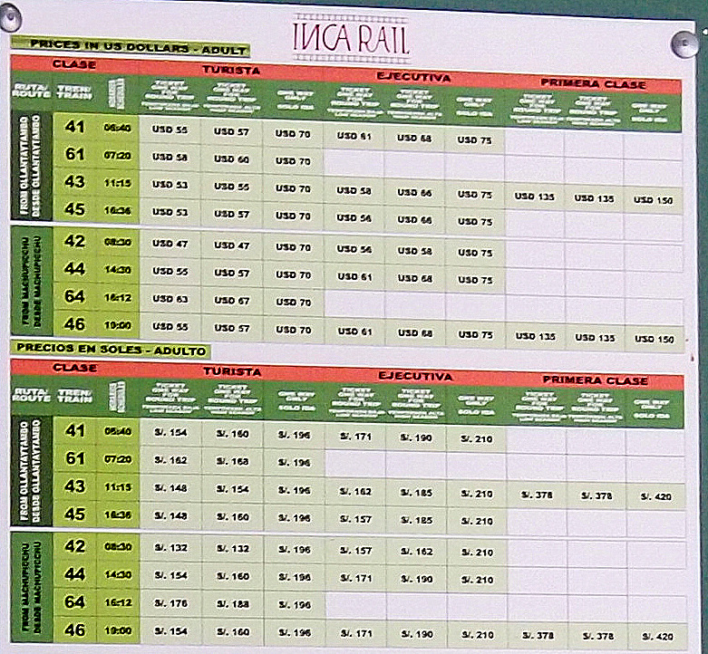 オリャンタイタンボ⇔マチュピチュ村間を往復で利用しました。片道50kmの道のりを1時間半ほどかけて、ゆっくりと走ります。乗車時間によって乗車料金が異なり、往復で大体100米ドルほどかかりました。観光鉄道ですが、距離の割にはお高いです。