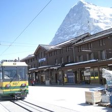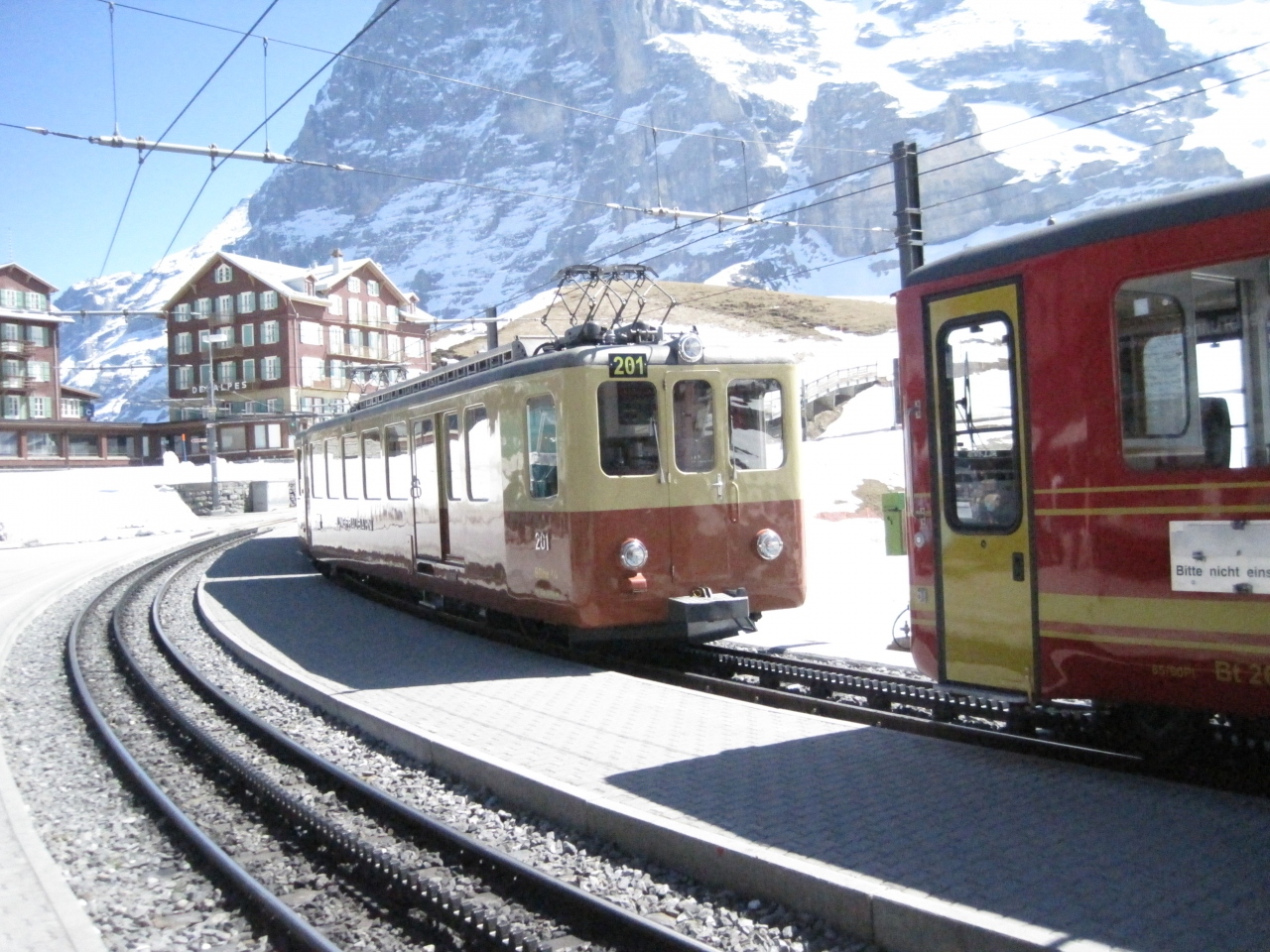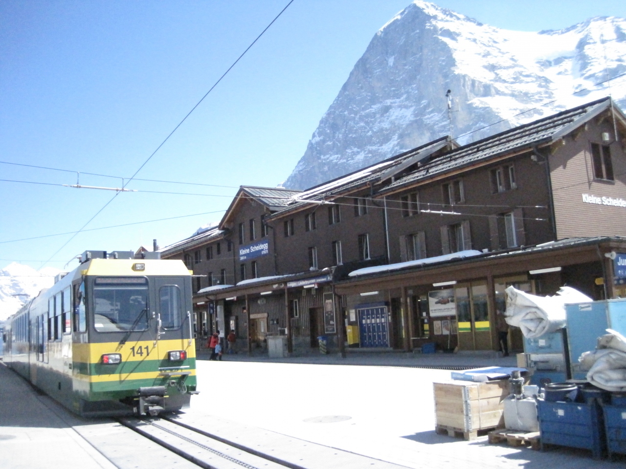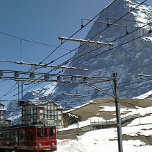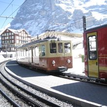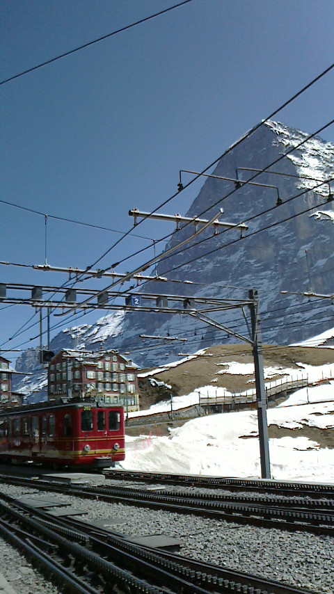 かなりの急斜面を上っていく登山電車で、傾きが怖いくらいでした。山は夏にはハイキングコースにもなっているようですが、まだまだ雪の残る季節なので雪景色を眺めながらの電車旅でした。