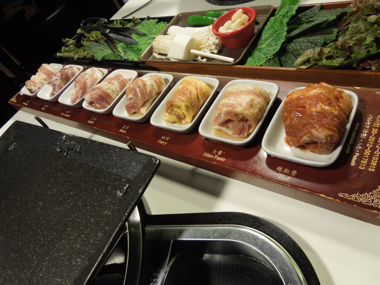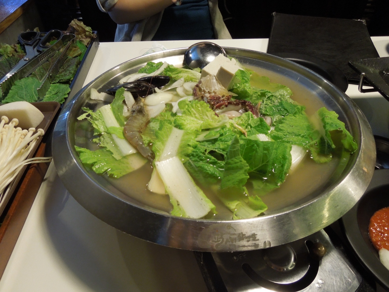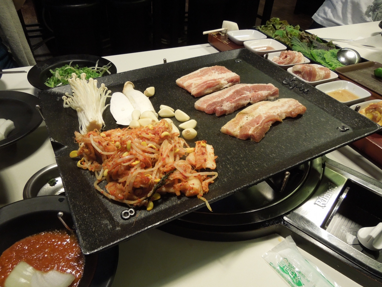 予約せず、早めのディナーで6時位に行きました。しかし、とても混雑していて20分位待ちました。団体客がたくさんいたので中々席に着けません。私たちが出るころには大行列でした。八色セットを注文しましたが、2人で食べるにはボリュームがありすぎて残してしまいました。八種の味付けサムギョプサル以外に海鮮鍋がついてます。スタッフがはさみでカットしてくれたのがありがたかったです。
