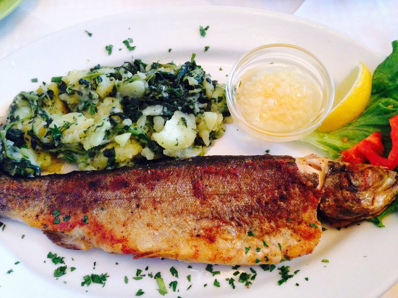 近くの村でマス料理をたべました。地元の名物です。美味しかったです。