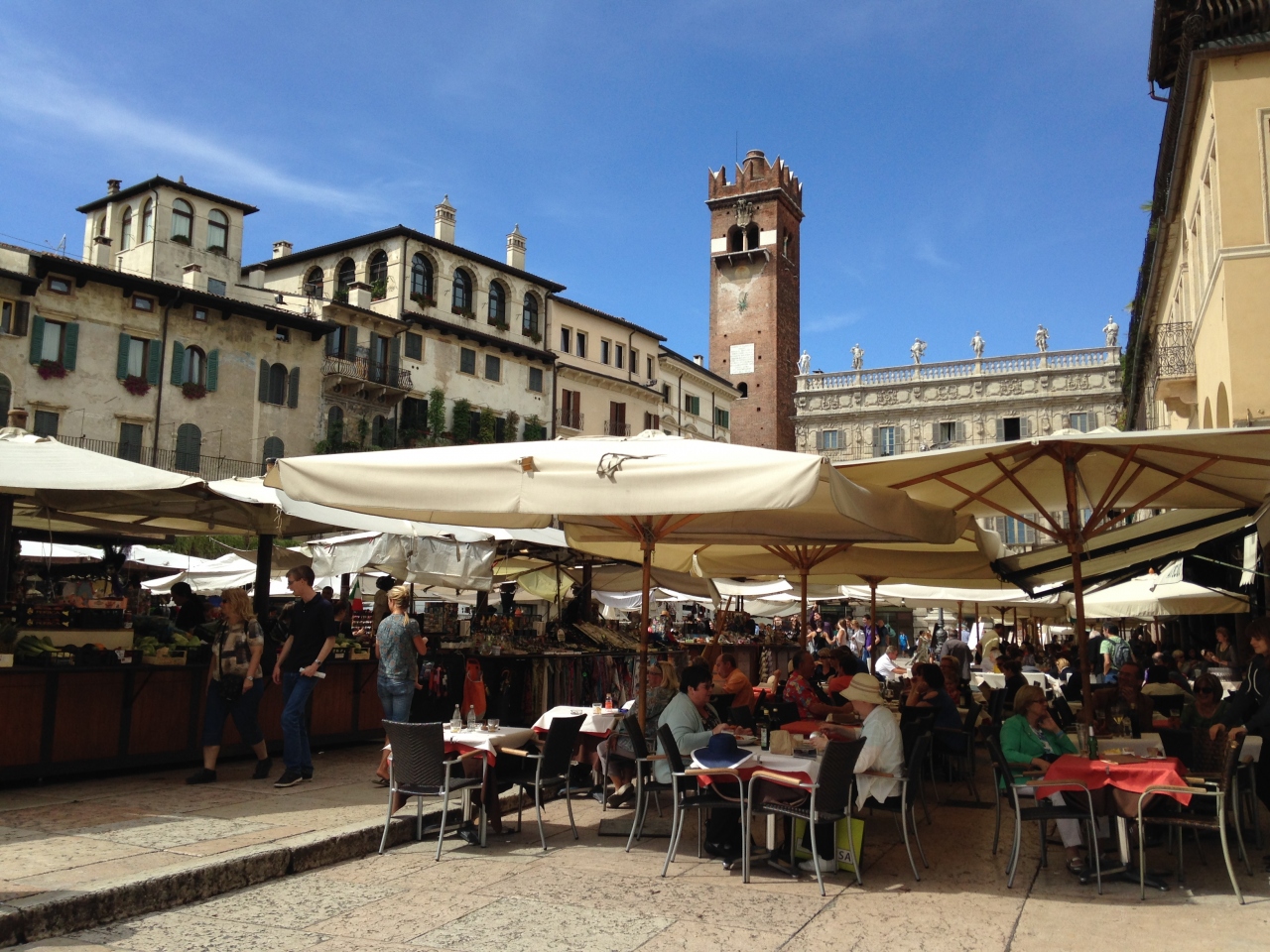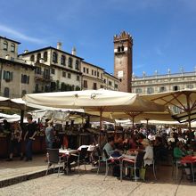 沢山の屋台が出ています。ベネチア土産も売られていました。青果物の屋台ではナスが小サイズのキャベツ並みの大きさだったりで見るだけでも楽しかったです。周りはレストランのテラスとなっていてピザなどは高くなかったです。
