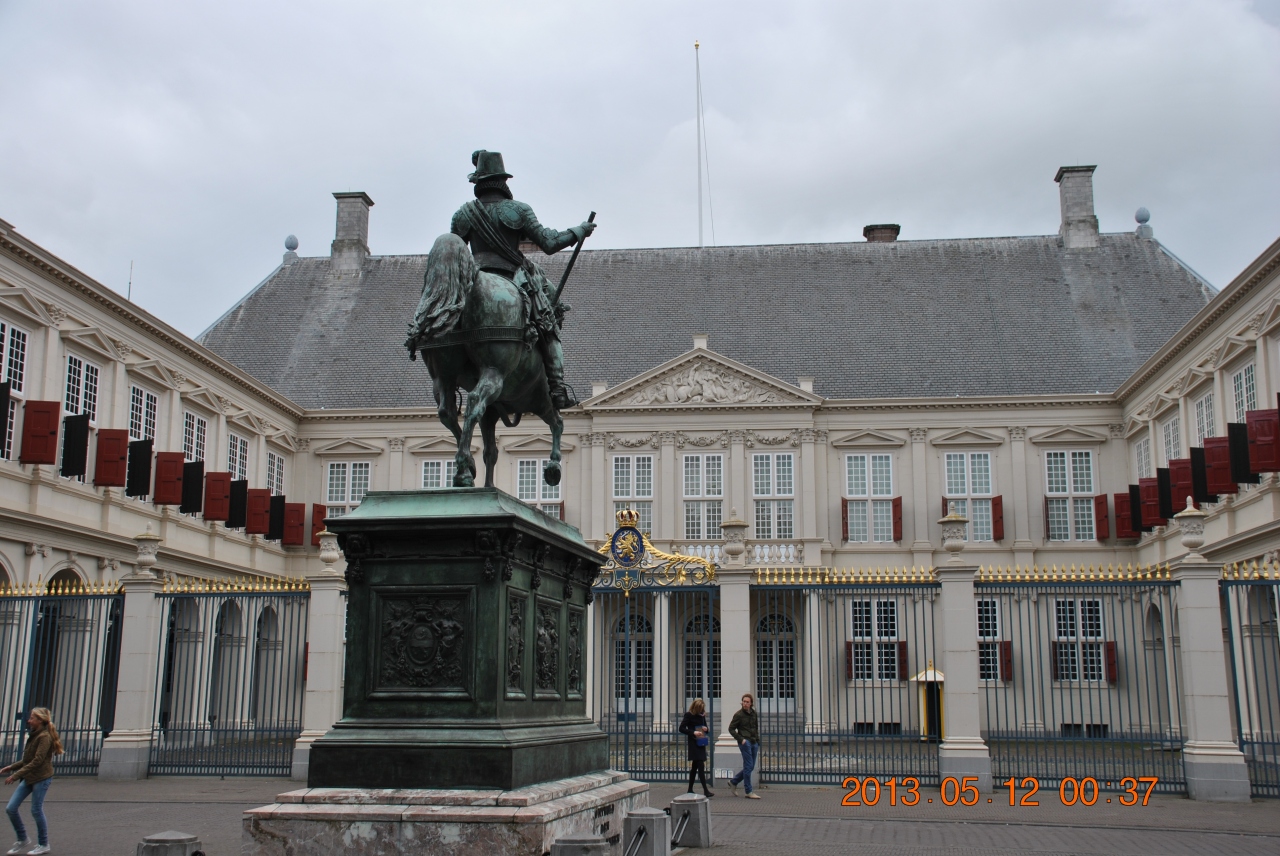 ビネンホフのホフ池から徒歩5分ほどのところにある女王様の執務室と呼ばれる宮殿です。正門の前にはこじんまりとした公園の中にオラニエ公の像が建っています。ここからハーグ中央駅までは多少の距離があるので、年配のご婦人のエスコートでトラムを利用しました。