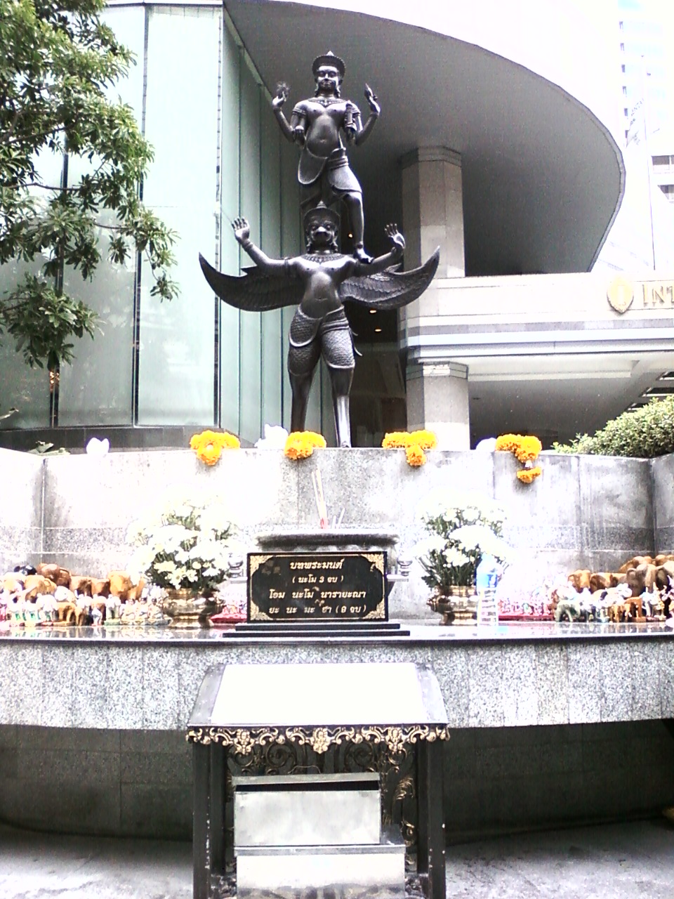 このプラ ナラーイソンスバンは、BTSチットロム駅側のインターコンチネンタルホテル前にある神様像です。羽を持った神様の肩の上にもう一人の神様が乗った変わった像で、日本では見られないこれぞアジアという感じの神様像です。場所的にアクセスし易いので、観光のついでにでも立ち寄ってみると良いと思います。