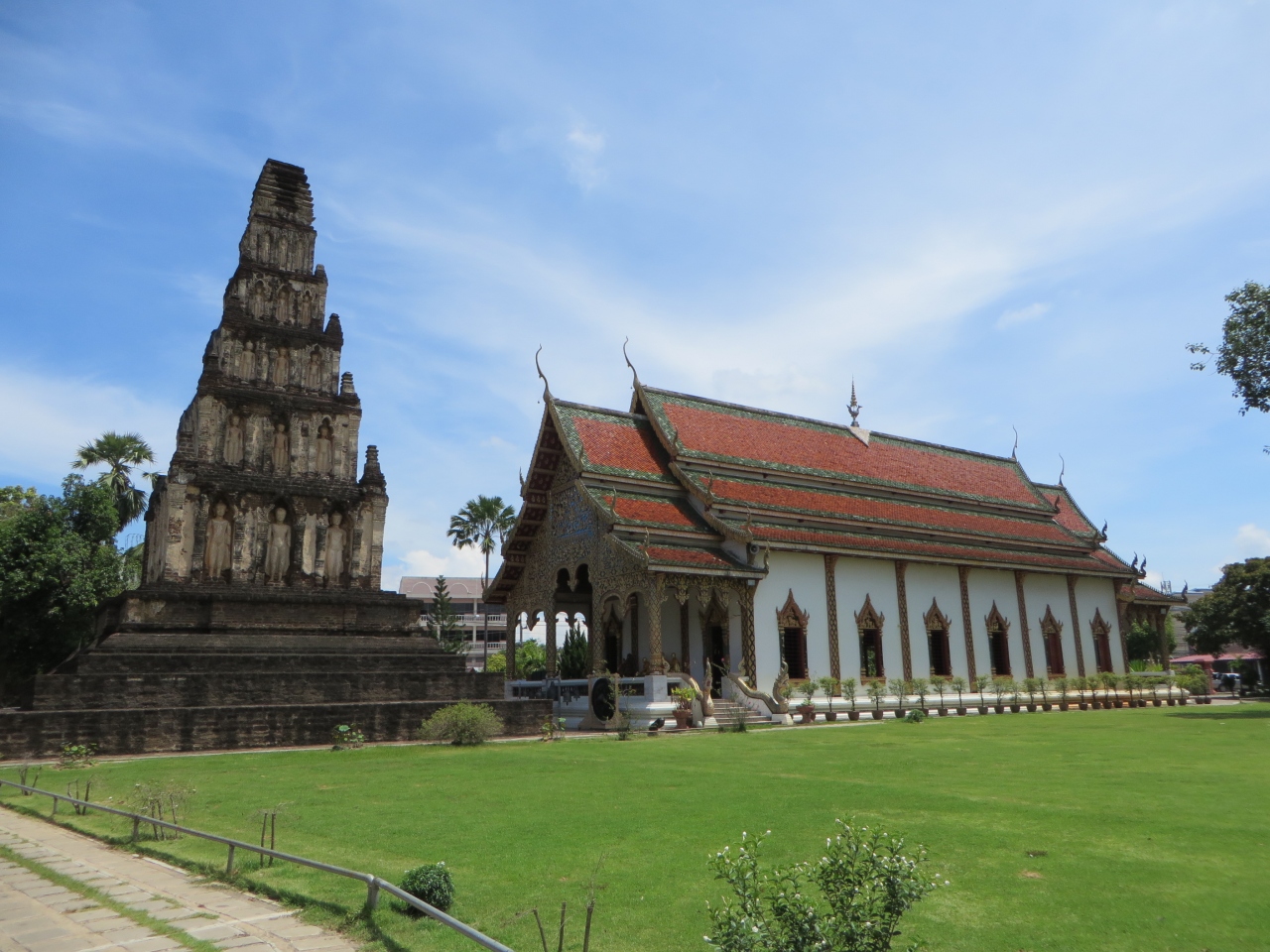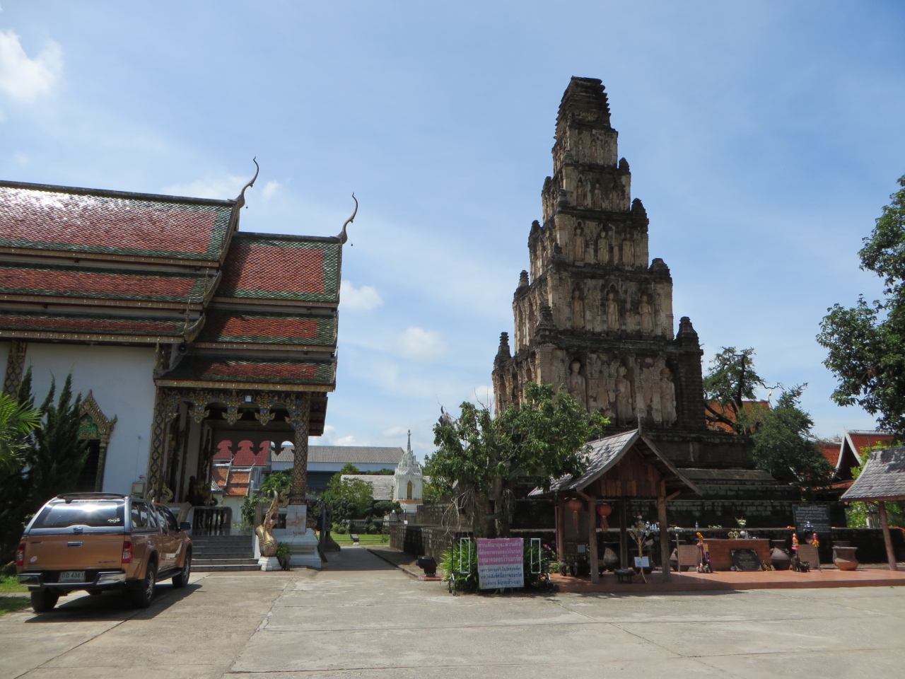 ランプーン中心地から車で10分位、正門を入ると本堂と高さ21mの多層式四角錐の古い石造仏塔があります。この石塔には60もの仏像が納られ、この寺名で仏塔を建てたされる王妃が祀られているそうです。お寺は綺麗に整備されています。本堂横は緑の広い広場となっており、その周りに僧坊等の建物があります。普段は参拝者は少ないようです。静かでした。小坊主が正門入口横で木製品作りをしてました。