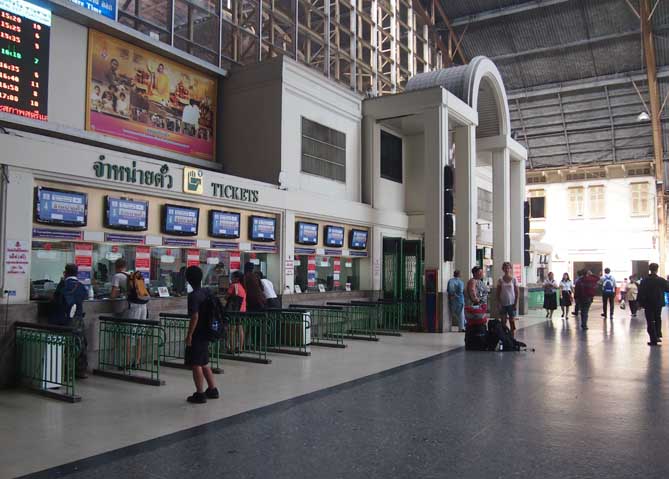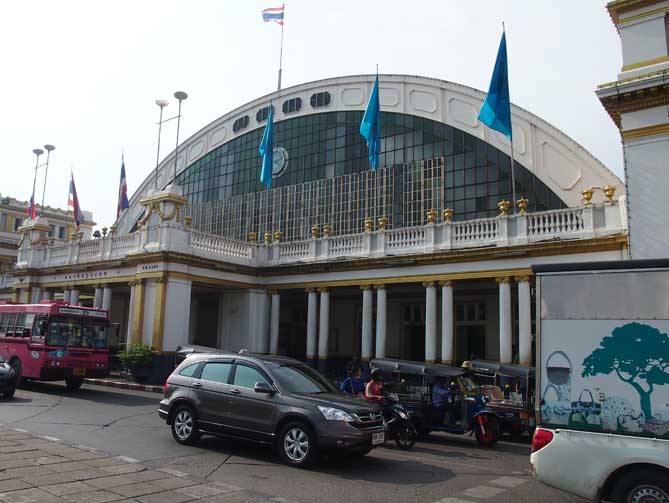 MRTファラムポーン駅とも直結している、バンコクの国営鉄道駅。かまぼこ型の駅舎の先に長距離列車が出入りするプラットフォームが並んでいます。
