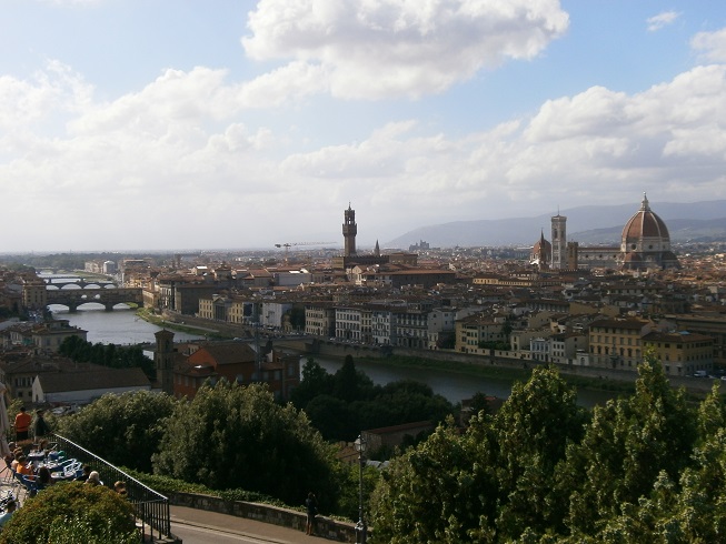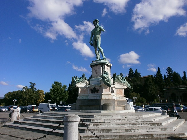 フィレンツェの市街地を眺める絶好の展望台です。ドゥオーモ、ジョットの鐘楼、ヴェッキオ宮殿やポンテ・ヴェッキオなど、主なポイントが見渡せます。歩くと少し遠いので、バス路線の紹介がありますが、フィレンツェ中心地からタクシーでも10ユーロほどです。帰りは徒歩でポンテ・ヴェッキオをめざせば、20分くらいでしょう。観光バスもやってくるのでけっこうにぎやかで、お土産屋さん、飲み物の屋台もあります。広場中央に、ミケランジェロのダヴィデ像があります。静かにこの展望を楽しみたいという人は、ここから徒歩5分くらいのサン・ミニアート・アル・モンテ教会がおすすめです。教会の石段や広場からも、ほぼ同じ展望が楽しめます。