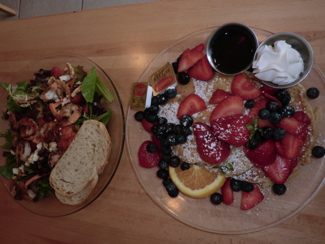 フルーツのせパンケーキとサラダを一皿ずつ注文して、二人で食べて丁度いいくらいだった。店内が寒いので飲み物はホットコーヒーにして正解だった。フルーツがたっぷり乗ったパンケーキは見ただけでハッピーな気分になった。でもフルーツはすっぱめだったし、パンケーキそのものはふわふわ感やしっとり感が無く薄めで、お味はいたって普通だった。クリームがもう少したっぷりあった方が良かったと思った。10時前に到着して、30分待ちくらいだった。タクシーで行って片道10ドルくらいだった。アクセス等も考えたら、次回パンケーキを食べたい時は別の店にするかもしれない。