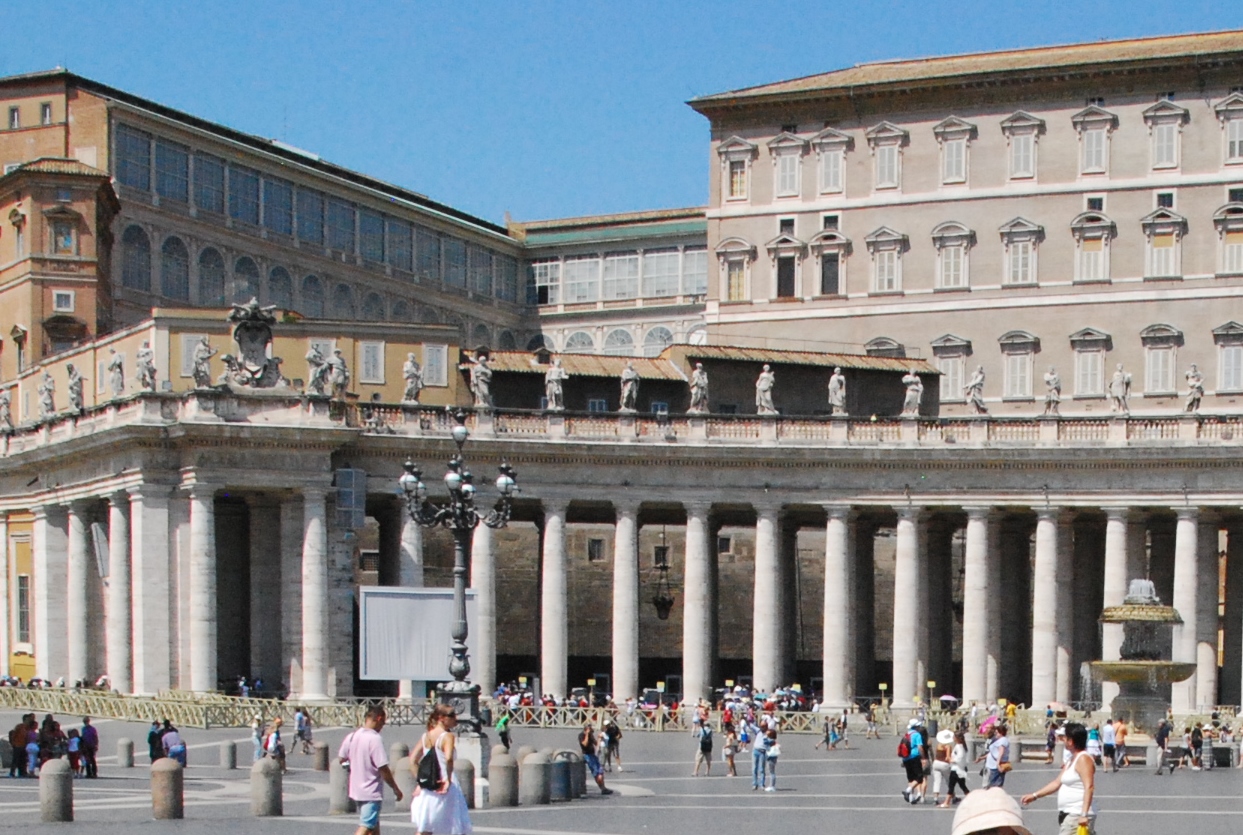 サンピエトロ大聖堂の正面に広がる広場です。バチカン市国やローマ教皇の大切な行事があるときは、大勢の人が広場に集まります。広場内に2か所ある円盤のある場所に立つと、4本の円柱が重なって1本の柱に見えるという、ベルニーニ・ポイントが有名です。実際に立ってみましたが,間違いなく1本の円柱に見えました。