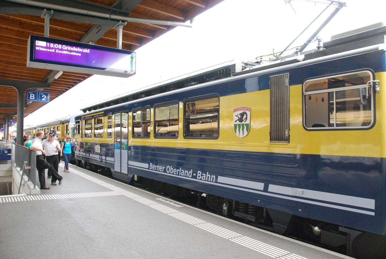 インターラーケンオスト駅からグリンデルワルトに行く列車です。前方に乗ると、ラウターブルンネンに行ってしまうので要注意です。30分の道のりで、進行方向右側に座ると、雄大なアルプスの山々が迫ってくるように見えます。