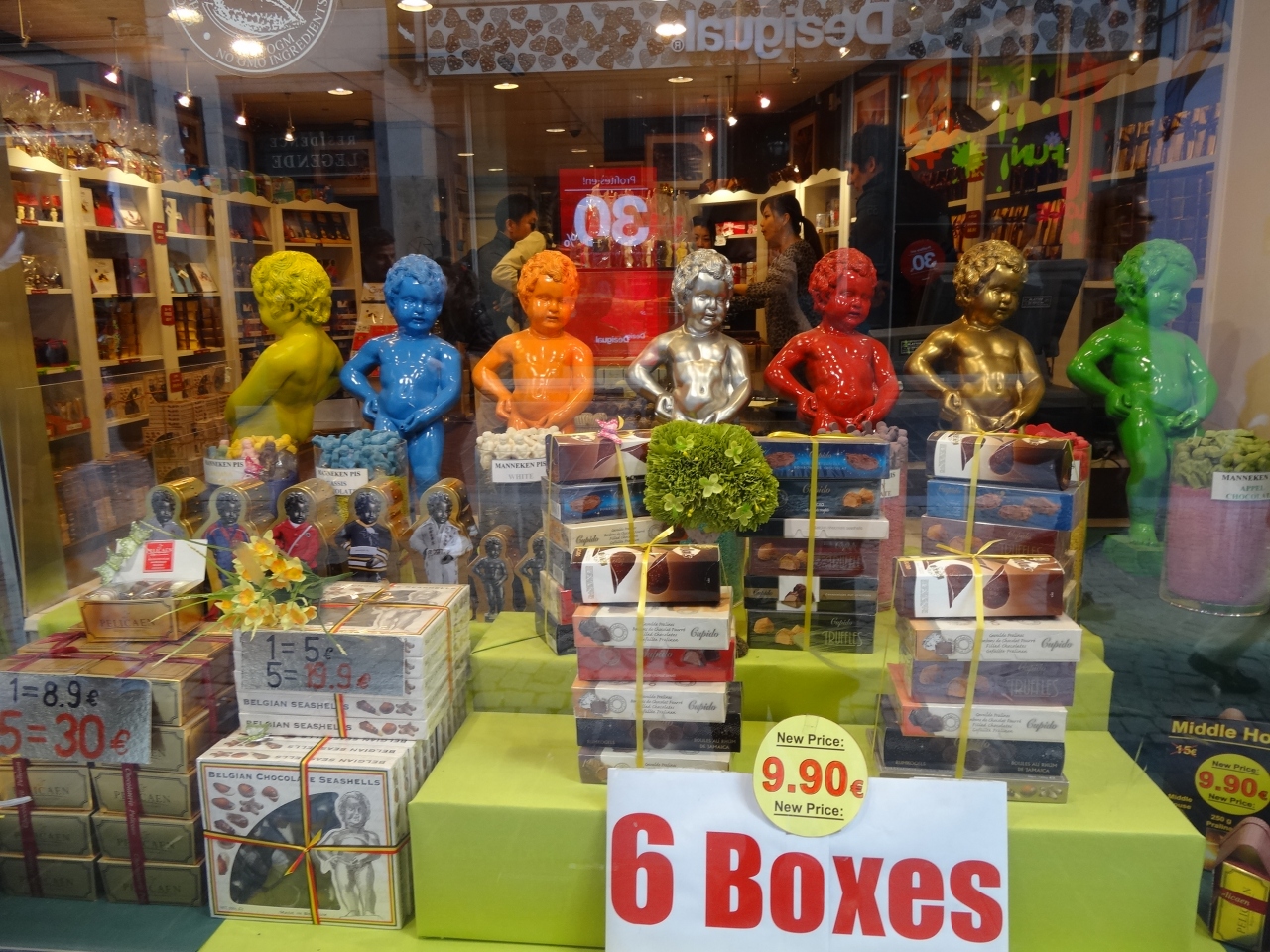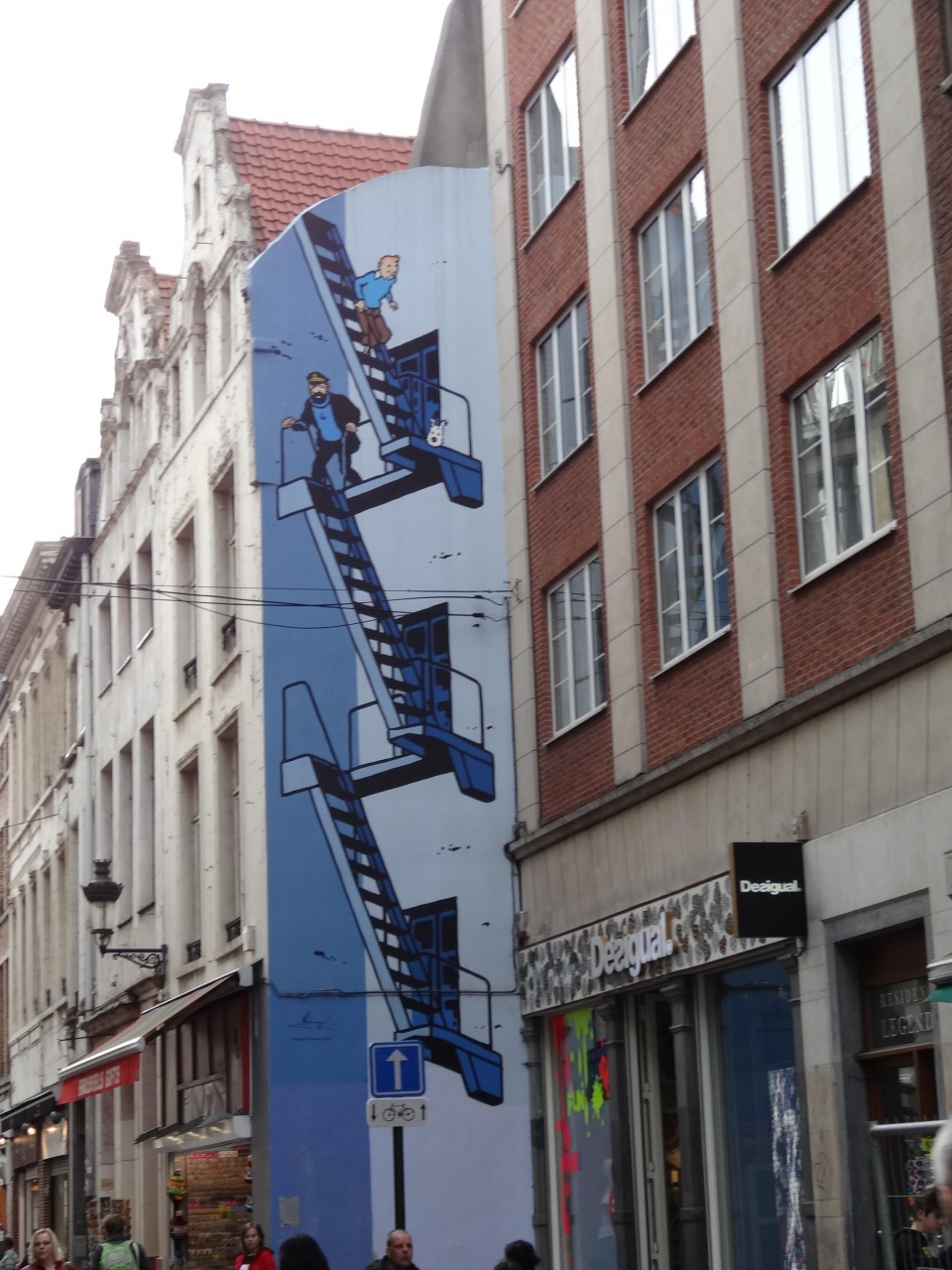 この通りには有名なタンタンの壁画もありますし、カラフルな小便小僧の並ぶワッフル屋さんもたくさんあります。