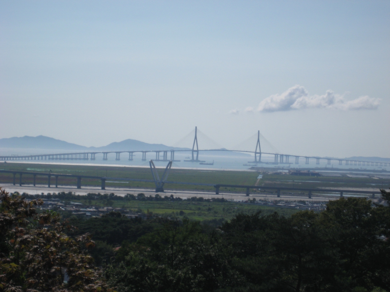 仁川空港から2時間のトランジットツアーで仁川の寺院をまわるときにバスでわたりました。かなり長い橋で船も数多くあり、橋を渡りきると高層マンション群と旧市街があり風景が、ガラッと変わるので面白かったです。