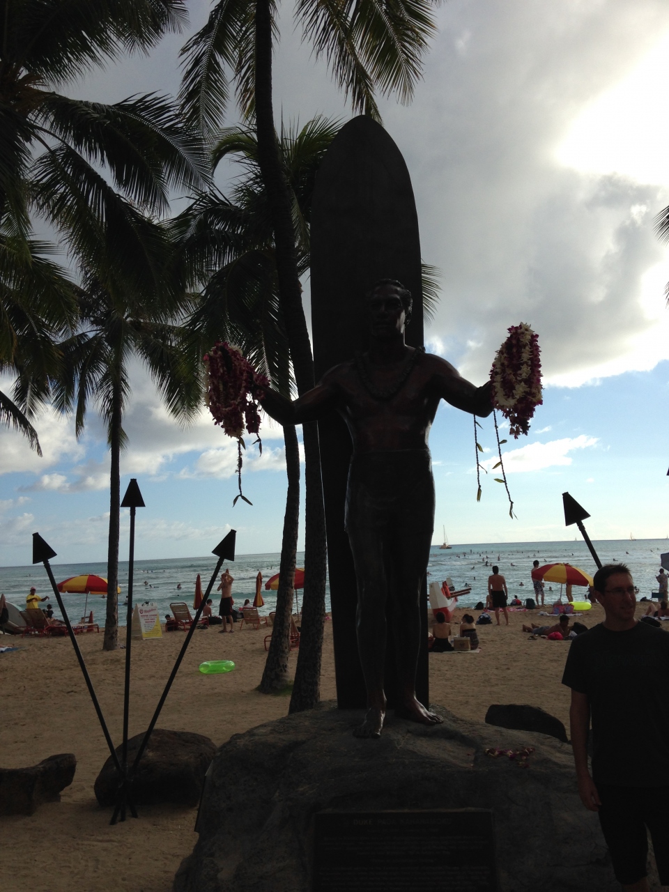 この像の周りは人がいっぱいですたとえばこの前にいろいろな会社のトロリーの乗り場があるので人でいっぱいです写真を撮る人もひっきりなしでいて張るしワイキキビーチの真ん中に位置するので待合場所にする人もいます