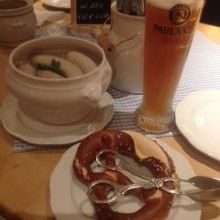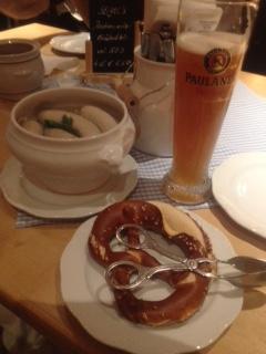 400年前からあるという、伝統的ドイツ料理店。お店の前は通り過ぎたのですが、他店の看板しか見当たらず、もう一度戻って来たら、入り口の上にお店の名前が書いてありました。入り口は狭いですが、中は広く、ミュンヘンに来たらと白ソーセージと白ビールとプリッツエルを頼みました。白ソーセージはボイルされたものが、蓋付きの陶器に入って出てき、味はあっさりしていて上品、甘めのマスタードを付けて頂きました。店内も落ち着いた雰囲気でした。
