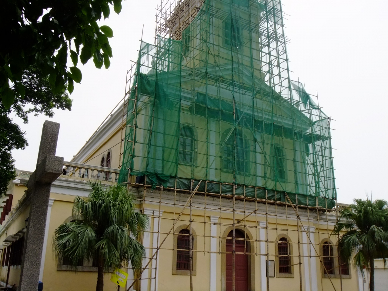 タイパの商店街から少し先に行った、坂の途中にある教会。タイパでは唯一のカトリック教会らしい。丘の上にあるし、周りにビルなどはないので、よくドラマなどの撮影に使われるらしい。クリームイエローの建物はかわいいが、行ったときは修復中であった。