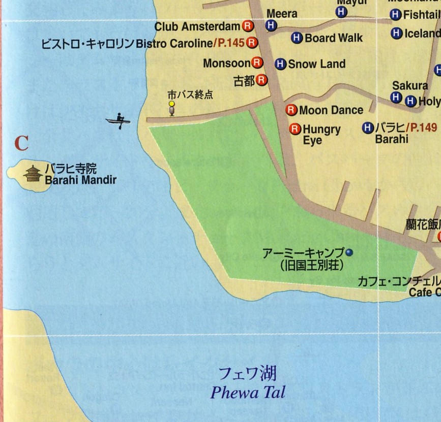 - レークサイド通り沿い、旧王国別荘跡=現アーミーキャンプすぐそば。近くに市内へのバス停があり、フェワ湖上にあるヒンズー寺院へのボート乗り場そば