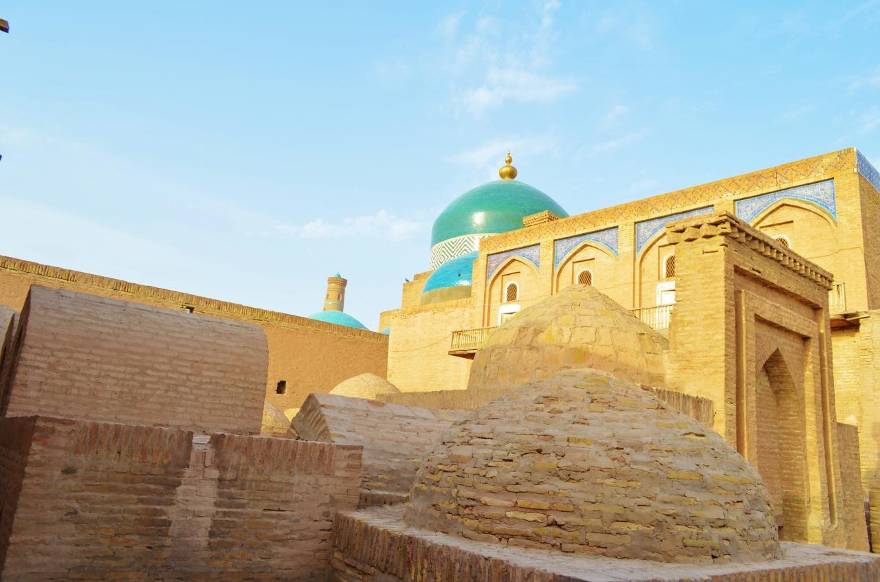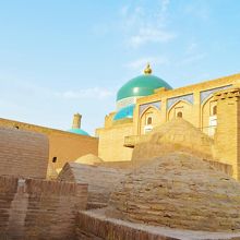 パフラヴァーン・マフムード廟。13世紀中葉から14世紀前半に生きたパフラヴァーンが眠っている廟。彼は毛皮職人でありながら、詩人でもあり、そして武道にも丈ていた。廟の亀の甲羅のようになっているのは代々の聖者たちが眠る。甲羅のようになっている墓はウズベク人の証し。四角なものはトルクメン人。