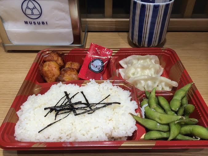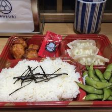 ご飯、唐揚げ、餃子(蒸し餃子)、枝豆・・・ これで幕の内と言われたら日本人としては困りますね(笑)