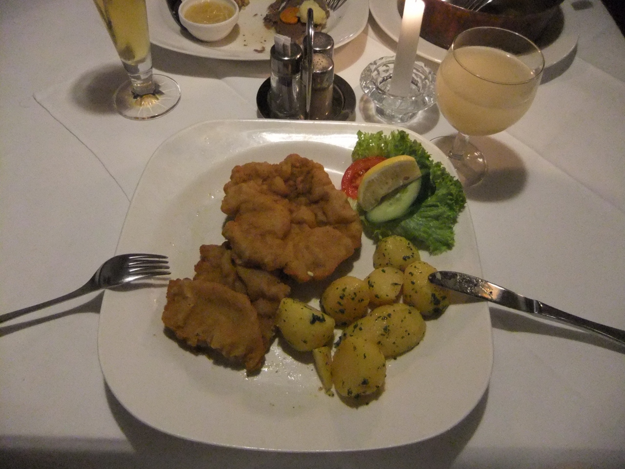 シュニッツェルはちゃんと仔牛で、薄くかりっと揚がり、さっぱりしていてぺろりと食べられました。付け合わせの茹でジャガイモもゆで方がちょうどでした。