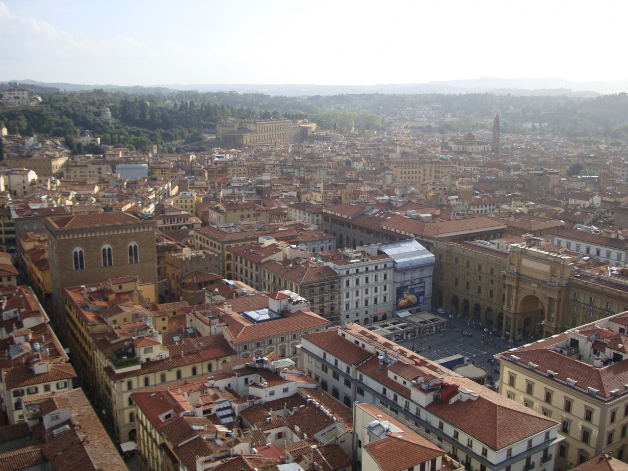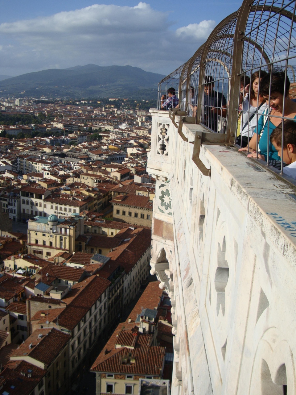 ジョットの鐘楼の券売所で共通チケット10ユーロを購入したのが土曜日の16時過ぎでした。クーポラの開場時間17時40分までに十分間に合うと思ったものの、行列者数との関係から当日はクーポラには入れてもらえませんでした。もし1日で両方を見るのなら、購入時間は早めのほうがお勧めです。なお、共通券は最初の使用から24時間有効ですので、片方を翌日入場することも可能です。ただし、クーポラは日曜休み(ドゥオモだけなら日曜午前中のみ休み)ですので注意が必要です。私たちは土曜日に購入したため、日程の都合上クーポラはあきらめました。ジョットの鐘楼の内部階段は上に登るほど狭くなり、体格の良い外人さんとのすれ違いは壁に張り付くようにしてやっとでした。ただ、最上部からの眺めは格別で、鐘が鳴り響く時間に遭遇すれば、フィレンツェの街並みの景色と併せて最上の時間が過ごせると思います。