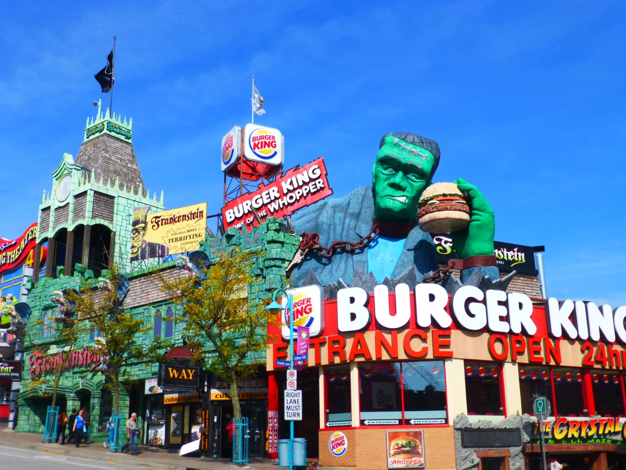 お化け屋敷的な 建物を飾りたてた見世物小屋の数々、観覧車、ファーストフード店、土産物店などが並んでいるアミューズメントストリートです。