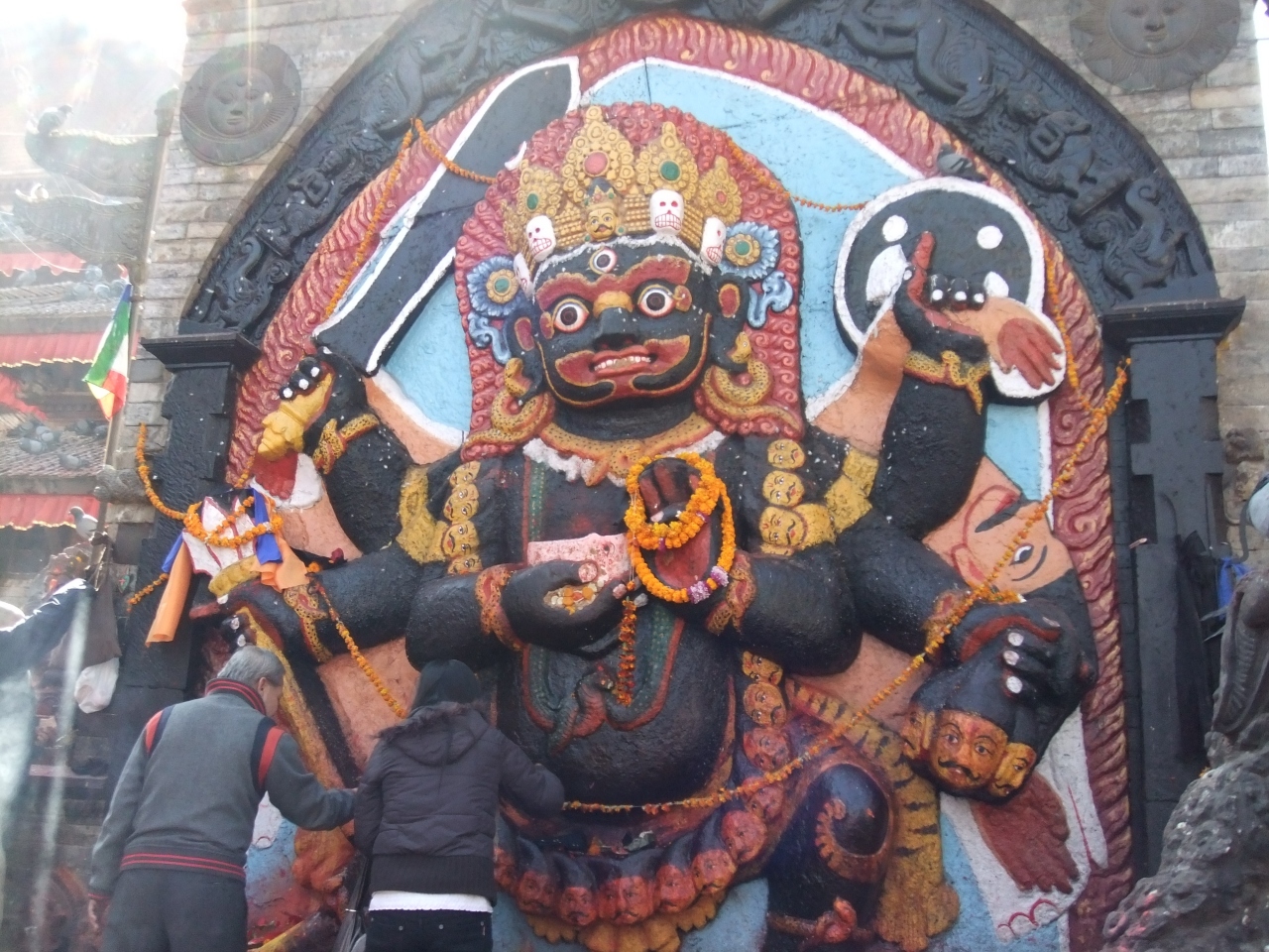 ダルバール広場からナサル・チョークに行った後に観ました。カトマンズの古い建物は茶色っぽい地味な色の建物が多いなか、一際派手な色彩で迫力満点なシバ神の化身の像。破壊神に睨まれたら、嘘もつけないくらいの懺悔の場所です