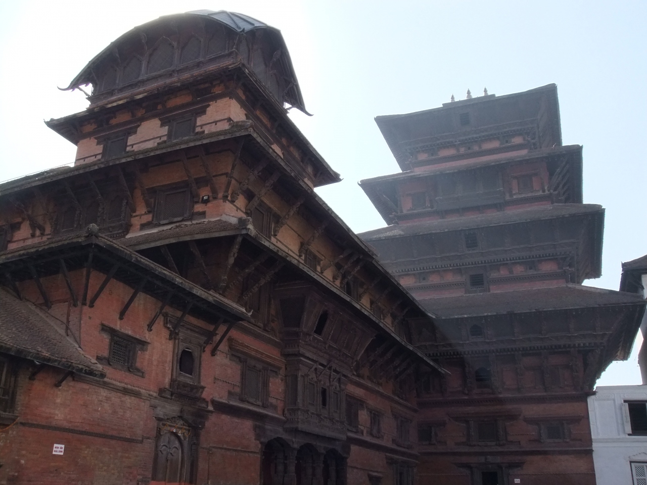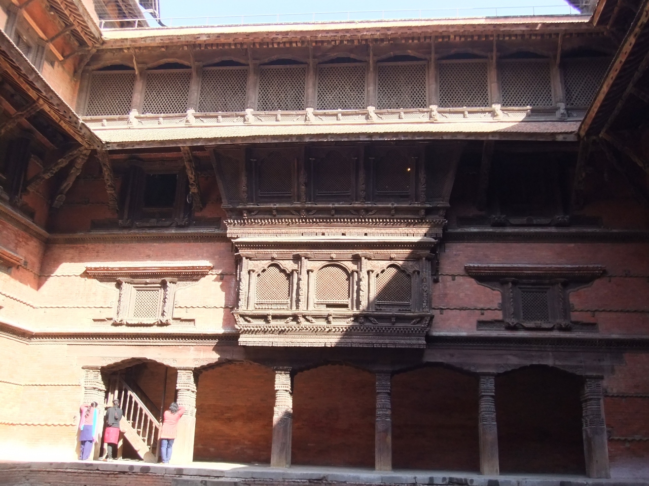 ダルバール広場からハヌマン像が見守る鮮やかな門をくぐると、ナサルチョークと呼ばれる旧王宮の中庭に入り、中庭から旧王宮などの建物を見上げます。この中庭では国家行事なども行われていたそうです。建物の通路には格子状の模様が施され、下界の者からは見えないようになっています