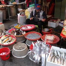 魚介類や乾物を見ると、手を出したくなるが、持ち帰りを考えると、買うのは難しい。