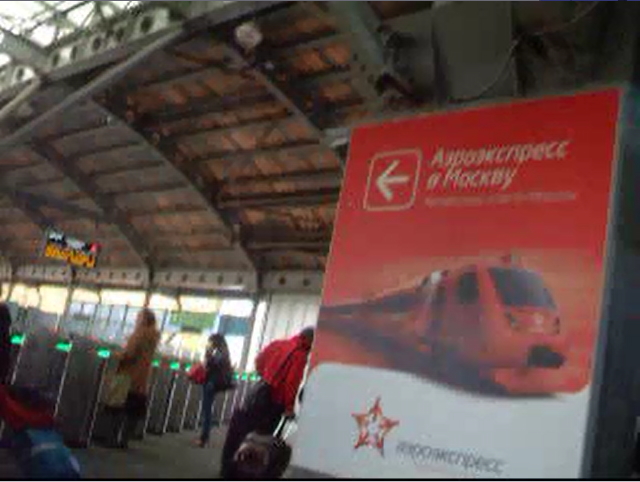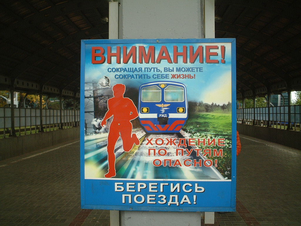 ホームは1つでいわゆる行き止まり式です。とても長いです。パブレツキー駅も行き止まり式で、出口はその先です。ということは、乗車前後で最低でも1編成分歩かなければなりません。ホームは途中まで屋根がありますが、殆ど青空状態です。10月3日で気温8℃、風を遮るものがないのでかなり寒いです。乗車口を示す掲示もありません。また禁煙でもないので吸殻があちこちにあります。列車が到着すると、人々が我先にと乗車口に群がります。列を作って待つという概念がありません。また、降りる人がいなくなるまで待つということもしません。隙あらばどんどん乗り込みます。シートは 3x2 の配列ですが中央で向きと配列が変わります。すいていれば3人掛けを1人で占有できます。車内販売も来ますが、まぁ誰も利用する人はいません。携帯電話は掛け放題です。マナーモードにするということもしません。これは何もロシアに限ったことではありませんが。面白いのは、線路の敷地内を人々が歩いていることです。日本だったら安全が確認されるまで、ストップしますが、線路の脇が生活道路になっているところもあります。