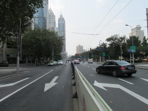 フランス租界の金陵中路、西路は西蔵南路から重慶南路までの東西を結ぶ路です。大規模な再開発で道路幅が広く右側は延安中路まで全て公園となっています。左がわは准海中路までの間、再開発されて商業ビルが建っています。