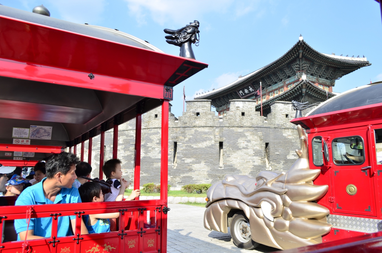 華城の城壁を歩いたり、龍?の乗り物に乗ったり歴史建造物、世界遺産でありながら、楽しめる場所です。