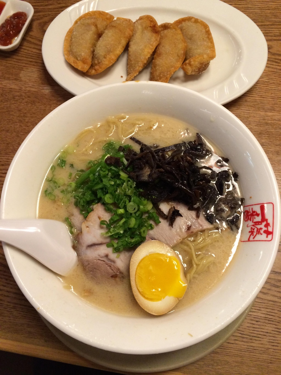 醤油ラーメンと豚骨ラーメンと揚げ餃子をたべました。まず揚げ餃子、なかなか美味しい。メインのラーメンは醤油はちょっとしょっぱ目でしたが豚骨スープはいい味です。しかし、麺がダマになってしまっていて、そこが残念でした。