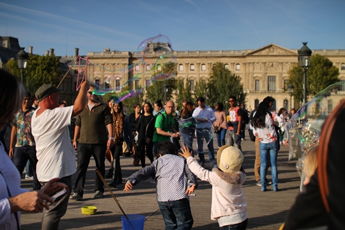 そこに座ってくつろぐひとたち シャボン玉で小銭を稼ぐ大道芸人