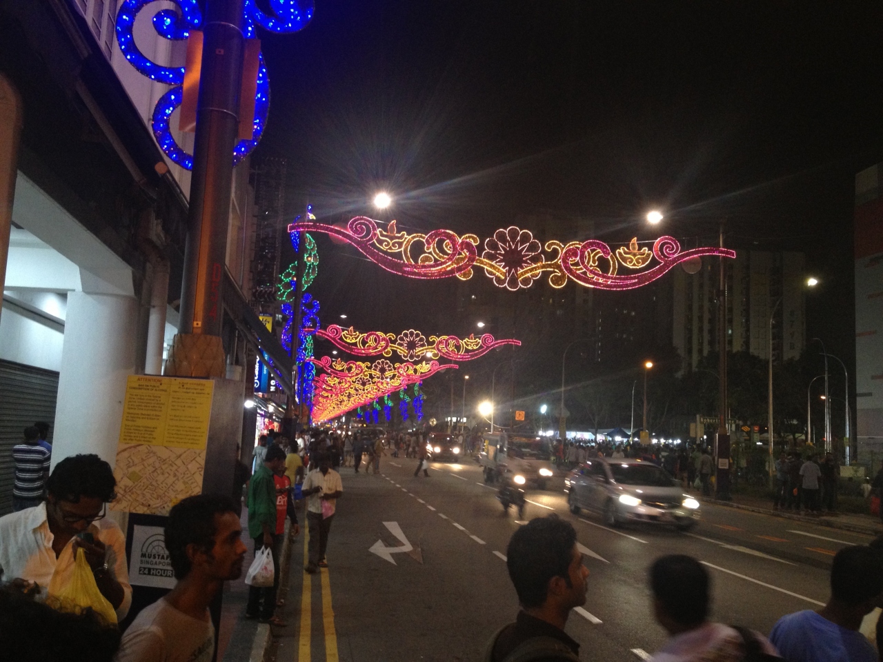 日曜日の夜8時過ぎに夕食を兼ねて見物に行きました。駅を降りた途端、インド人青年たちがひっきりなしに行き交う光景に驚きます。週末はシンガポールで働くインドの青年たちが集まって談笑するのが習慣だとのことでした。とにかく女性が歩いている姿はほとんどみかけません。かといって、危険な雰囲気は感じませんでした。まるでインドを旅行しているのかと錯覚するほどのインド人と出会えます(笑)。街並みも独特でしたが、できれば日が暮れる前に訪れた方が無難でしょう。夜だと写真がさっぱりでした。