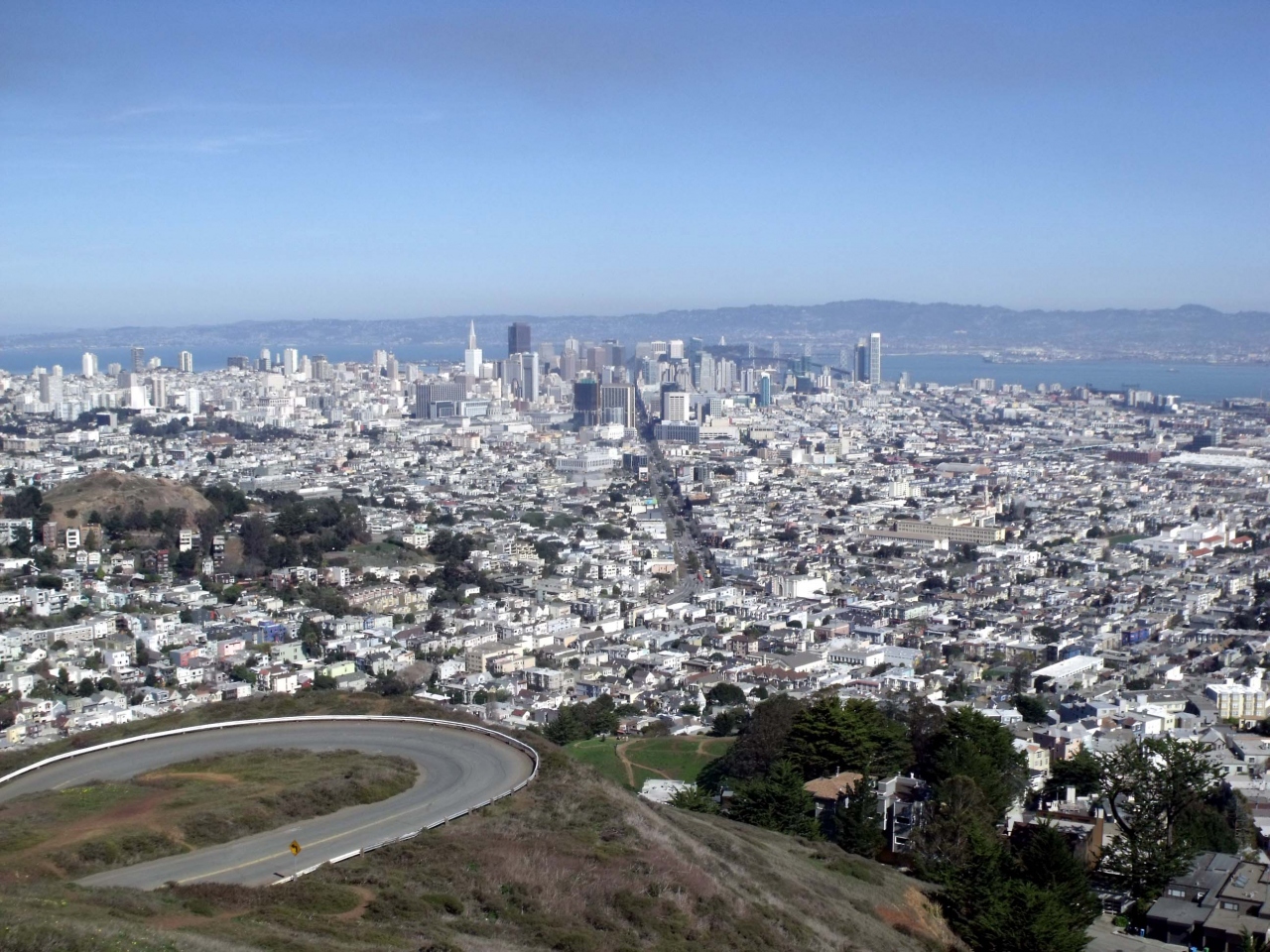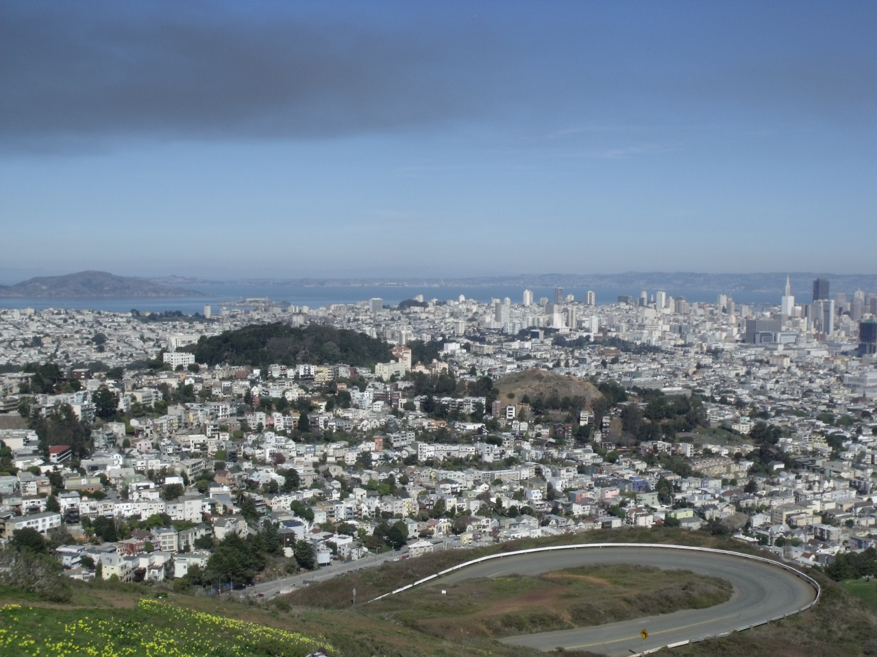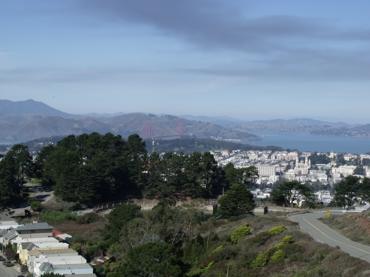MUNIのL線のカストロ駅から歩きました。30分ほど上って、眺望のいいお宅がある住宅街Twin Peaks Road へでます。さらに登ると人家が切れて、サンフランシスコの町が眼下に見えてきました。遠くEast Bay まで見えます。中央の直線がマーケットストリートです。左側の禿山の向こう側もうひとつの丘は、Buena Vista Park?左側、湾の入り口を臨むとGolden Gate Bridge が見えます。