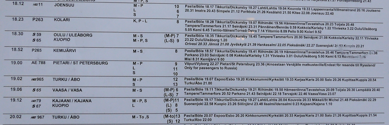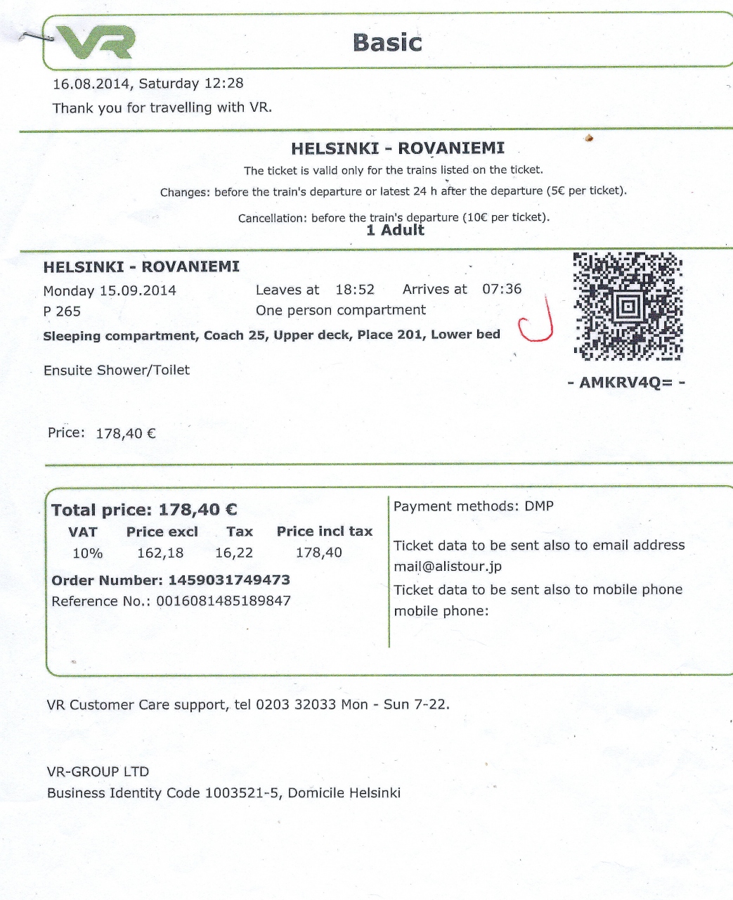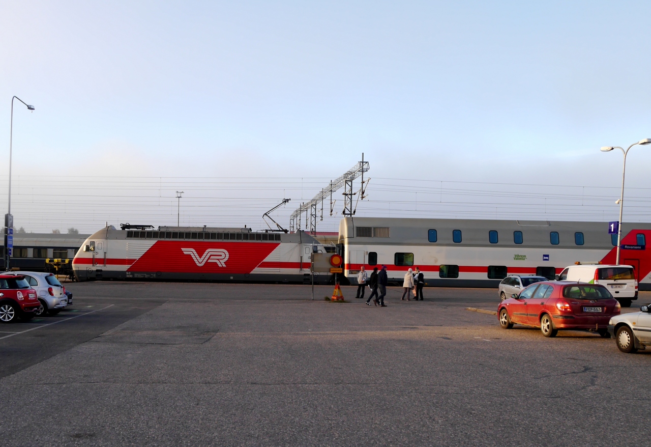 Helsinki-Rovaniemi,Kemijarvi,Kolari間の夜行寝台急行列車(座席車両もある),Pikajunaに乗る際には,日本から予約して,料金を支払うと,PDFが送られてくるので,それをプリンターで印刷していけばいい.昔はコンフォメーション書類を窓口で切符に交換しなければならなかったがすごく便利になった.日本もまねてほしい.しかしこの名前もない普通急行をサンタクロースエクスプレスなどとしゃれた名前を付けたのはどこのひとたちかなあ.時刻表を見ても,駅の看板見てもP265などと列車番号しか書いていない.しかし新型の二階建て車両は昔と比べて,個室にトイレ付となり,共同シャワーもあるが,狭くなってしまった.昔の古い客車の方が私には良かった.