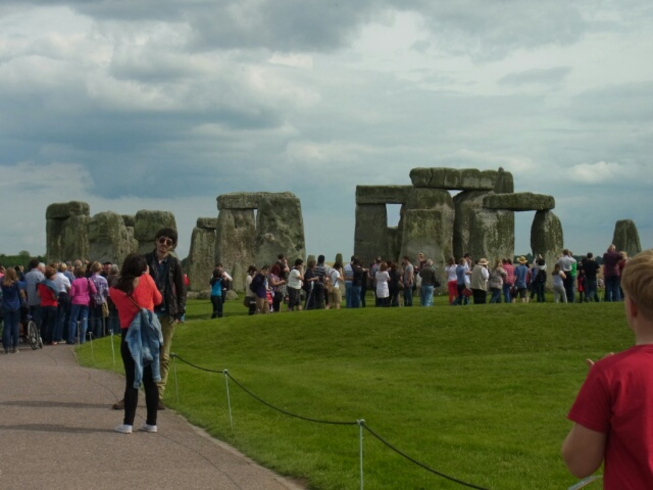 ロンドンから離れているストーンヘンジには日本語ガイド付きのバスツアーを利用しました。草原に突然見えるのは大きな石...ではなく沢山の観光バスと観光客です。あんな原っぱですが入場口があったと思います。その辺は英語が話せないのでガイド付きツアーは安心でした。入場後、少し歩くとストーンヘンジが見えます。