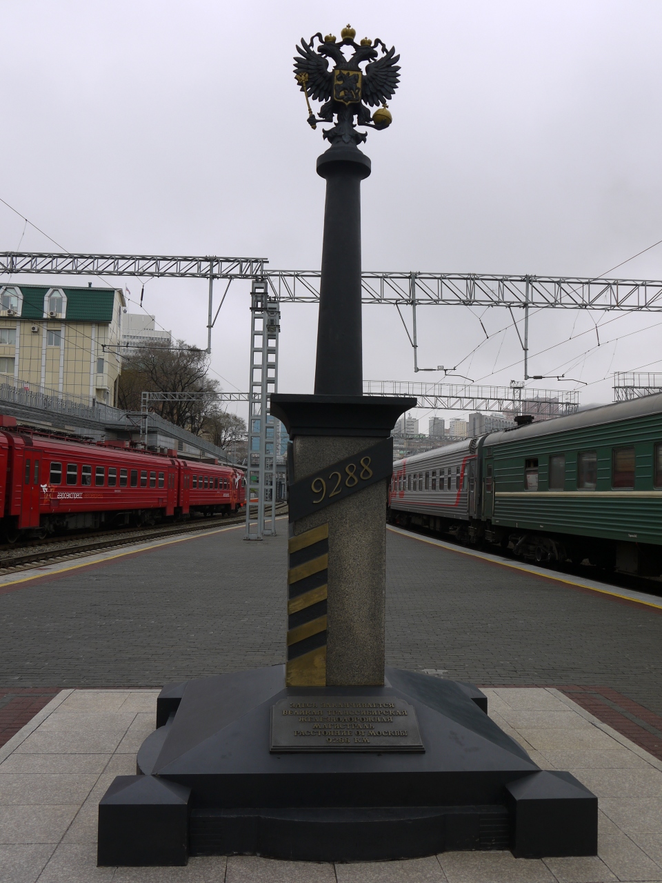 ホームに降りるとシベリア鉄道の案内図があったり、9288キロと表示されているキロポストがあったり、過去に使用されていたである蒸気機関車が展示されていたりもします。