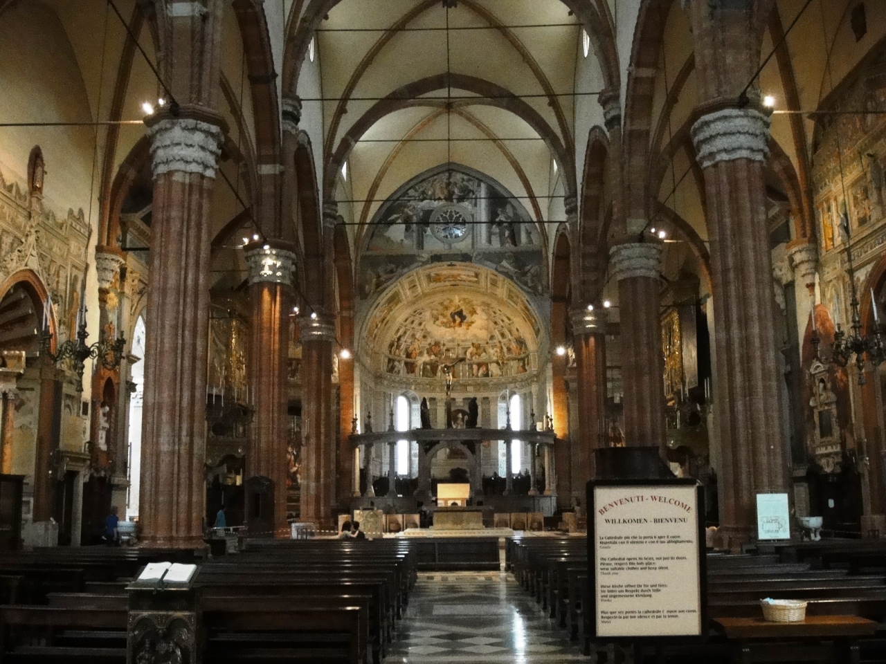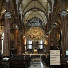 中は落ち着いた雰囲気で、壁や天井は美しい絵画やフレスコ画、豪華な装飾で飾られていました。現在の建物は12世紀に建てられたそうですが、その歴史は古代ローマまで遡るようです。奥には大聖堂の起源となったサンテレナ(Sant’Elena)教会のモザイクが残されています。