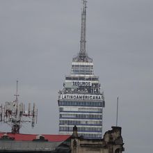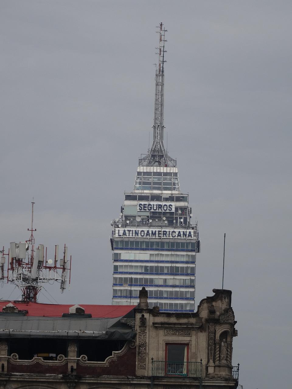 ラテンアメリカ・タワー (Torre Latinoamericano) メキシコシティ 夜、灯台のように輝いている姿を見ることができます。写真は、王立宮殿の前(ソカロ広場)から昼間に写したものです。私が宿泊したアラメダ公園の近くのホテルからも同様に見えました。きっと市内のどこからでも見えると思います。それだけ巨大だということです。、