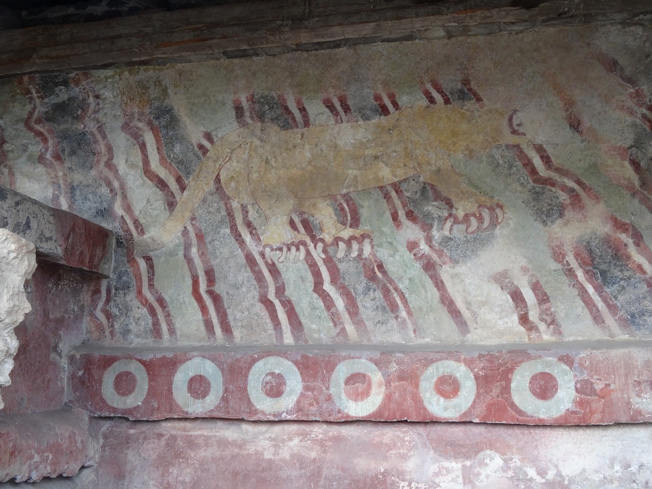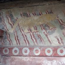 テオティワカン遺跡「死者の道 (La Calle de los Muertos)」確かに結構な距離がありますが、月のピラミッドに登り、次に太陽のピラミッドに登るために向かう途中にあり、月のピラミッドの興奮に浮き立っているとあっという間でした。道沿いには、動物の絵などがある建物があります。