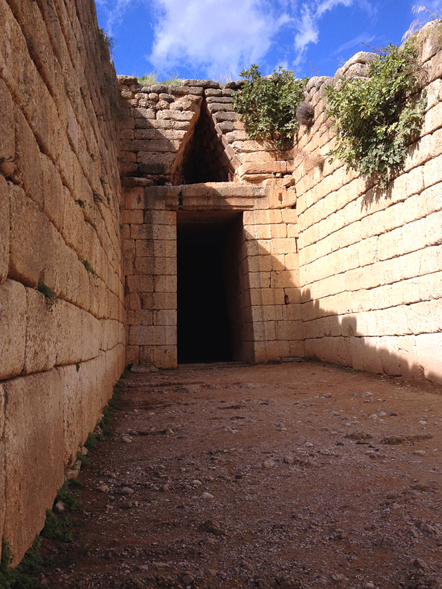 ミケーネのメイン遺跡から300mほど離れた場所にある遺跡で、アトレウスの宝庫と呼ばれる蜂の巣のようなドーム状の内部構造を持つ墳墓です。今から3300年ほど前に造られたものだそうです。アガメムノンの墓とも言われていますが、この墓がアガメムノンの墓であるかどうかは立証されていません。先ず驚かされるのはドーム入口にある巨大なまぐさ石です、長さ8m、幅5m、厚さ1.2mで、推定ではなんと120トンもあるそうです。巨石の上には三角形に開いている空洞部分が設けられています。多分、重量バランスの為と思われます。ドーム内部は直径が14.5m、天井の一番高い部分は13mありますが、実際に中に入りると直径以上に高さがあるかのような錯覚するはずです。残念ながら盗掘されているため、副葬品は見つかっておらず、この時代の人がどんな死生観で、このような不思議な空間を作ったのかが不明なのが残念なところです。いずれにしても太古にこれだけの技術を持っていた事実だけは驚愕せざるを得ません。