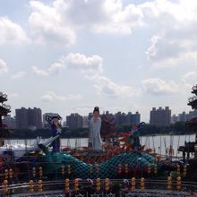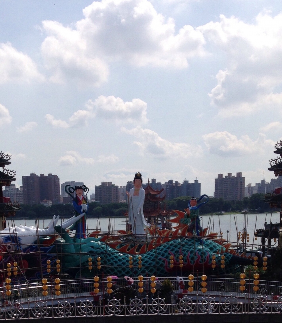 春秋閣は2つの塔からなる建物です。春閣と秋閣の間には、騎龍観音像があります。龍虎の塔から歩いてすぐの所にあり、きれいで鮮やかな建物ですが、残念ながら工事中で近づけませんでした。工事が終われば是非立ち寄りたいところです。