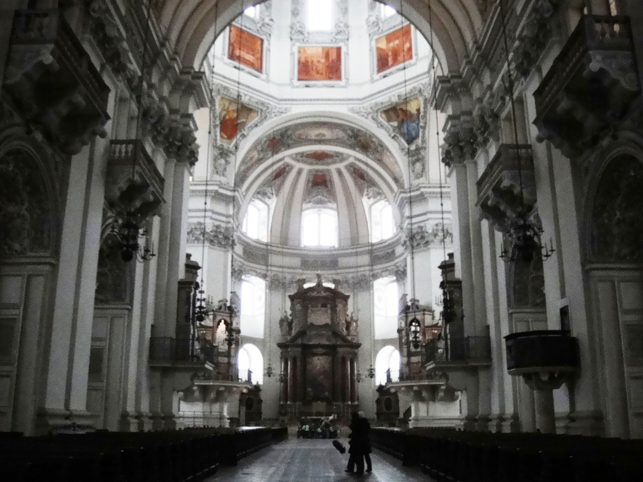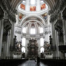 装飾がとても美しい教会です。祭壇のドームや壁、柱頭などあらゆるところに施された細かいスタッコ装飾が、華やかで目を見張ります。教会の入口あたりには、モーツァルトも洗礼を受けたといわれる洗礼盤が残されています。