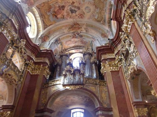ハウプト通りから修道院へは狭い階段を上って行く。右が雑貨屋さんで坂を上ると入口の門でチケットを購入して中庭に入る。ツアーの入り口が分かりずらく人の多く集まる所へ向かった。メルク修道院の展示室と天井画はゆうまでもなく立派。メルク修道院に付属している教会も想像以上に豪華だった。